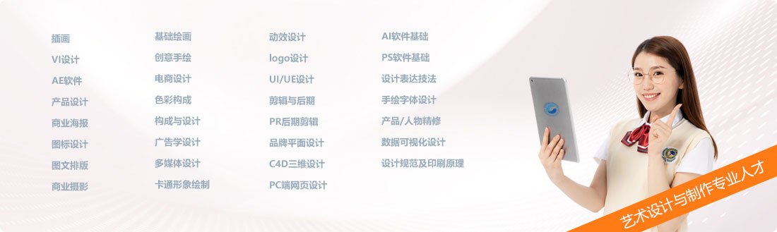 藝術(shù)設(shè)計(jì)與制作專業(yè)主要學(xué)習(xí)內(nèi)容包括:基礎(chǔ)繪畫(huà)、設(shè)計(jì)表達(dá)技法、構(gòu)成與設(shè)計(jì)、廣告學(xué)設(shè)計(jì)、多媒體設(shè)計(jì)、電商設(shè)計(jì)、產(chǎn)品設(shè)計(jì)等。學(xué)科圍繞互聯(lián)網(wǎng)時(shí)代的藝術(shù)設(shè)計(jì)需求,培養(yǎng)具有從事藝術(shù)設(shè)計(jì)相關(guān)工作的職業(yè)修養(yǎng)、掌握藝術(shù)設(shè)計(jì)的基本理論知識(shí)和基本技能,并具備專業(yè)實(shí)操能力的數(shù)字化藝術(shù)人才。
