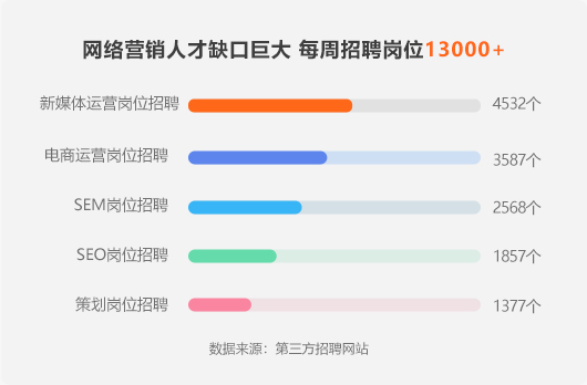 隨著5G等相關(guān)科技、互聯(lián)網(wǎng)新技術(shù)的快速發(fā)展及應用,更多的企業(yè)感受到網(wǎng)絡(luò)營銷的魅力,意識到自身進行數(shù)字化轉(zhuǎn)型的必要性,企業(yè)對互聯(lián)網(wǎng)營銷人才的需求量也越來越大。據(jù)相關(guān)數(shù)據(jù)統(tǒng)計,網(wǎng)絡(luò)營銷市場需求熱度居高不下,每周新增崗位約13000+,才供不應求。