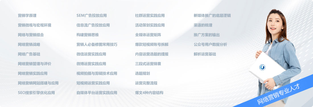 網(wǎng)絡(luò)營銷專業(yè)是以現(xiàn)代營銷理論為基礎(chǔ),借助網(wǎng)絡(luò)、通信和數(shù)字媒體技術(shù)實現(xiàn)營銷目標,為企業(yè)在各大互聯(lián)網(wǎng)平臺打造運營體系,擴大知名度、提升品牌曝光、實現(xiàn)產(chǎn)品轉(zhuǎn)化。通常是指利用抖音、快手、微信、微博、短視頻、社群等新興媒體平臺工具,進行產(chǎn)品宣傳、推廣、營銷的一系列運營手段。本專業(yè)培養(yǎng)獨創(chuàng)精神和較強實踐能力,掌握信息技術(shù)、電子商務、消費心理等基礎(chǔ)知識和網(wǎng)絡(luò)營銷策劃相關(guān)知識,具備網(wǎng)絡(luò)促銷策劃與實施、文案撰寫與發(fā)布、網(wǎng)絡(luò)客戶關(guān)系管理、數(shù)據(jù)分析應用等能力的高素質(zhì)技術(shù)技能人才。具體研究方向如下:網(wǎng)絡(luò)推廣、網(wǎng)絡(luò)營銷、廣告投放、自媒體運營、內(nèi)容運營、搜索引擎優(yōu)化、活動策劃、文案策劃等。